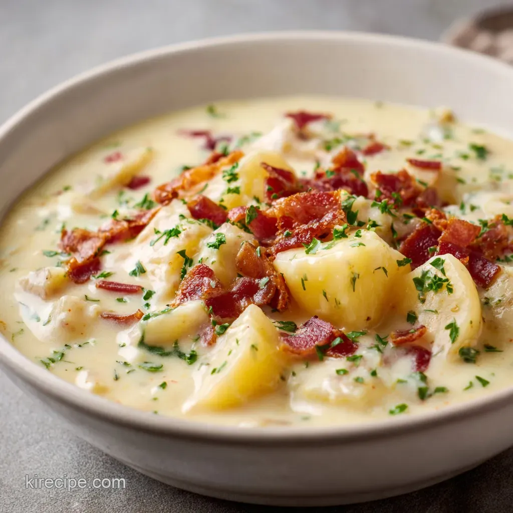 - Flavor/Texture Hook: Silky, buttery broth packed with salty bacon crumbles and sharp melted cheddar.